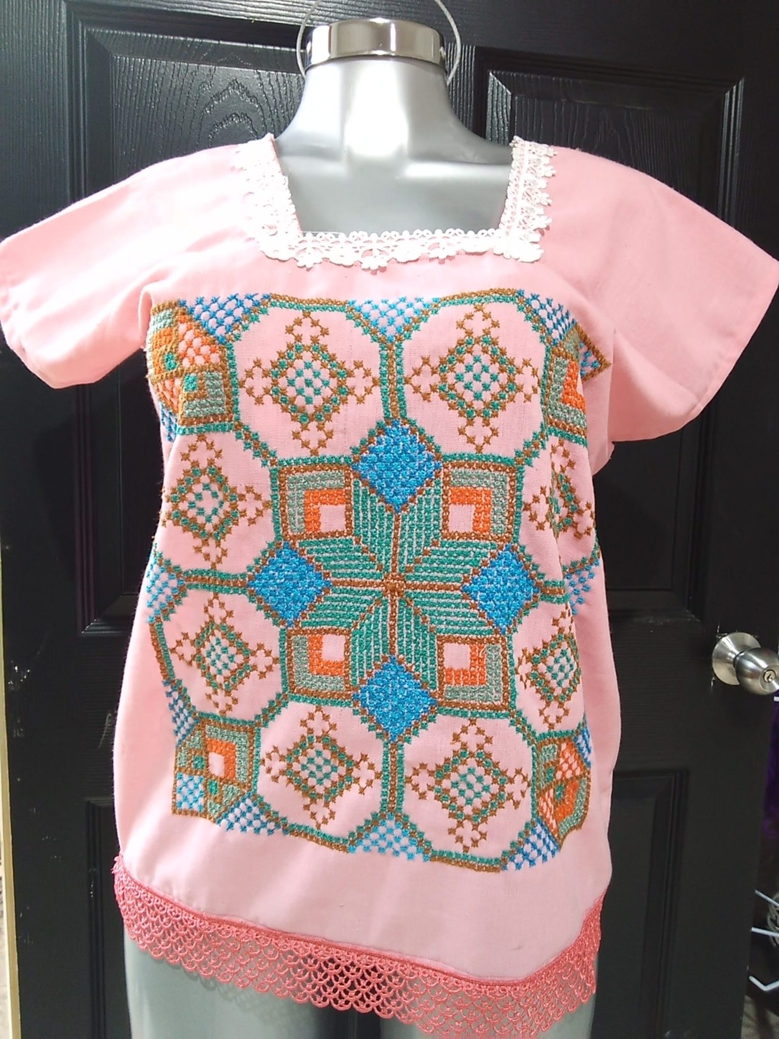 Blusa bordada tradicional, bordada a mano sobre tela de lino e hilos de algodón, con iconografía de estrella de rombos.