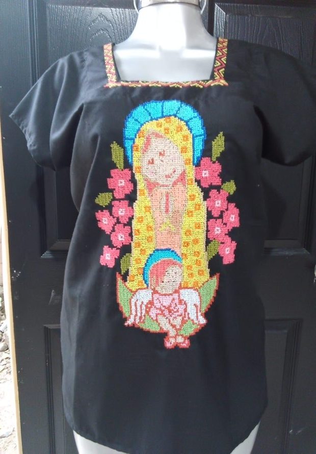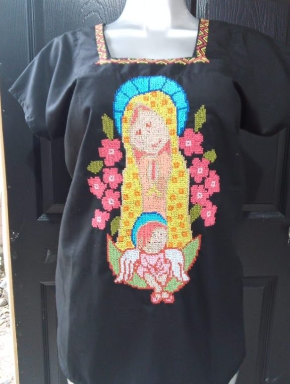Blusa bordada a mano en punto cruz, con imagen de la Virgen. Especial para una ocasión ceremonial.