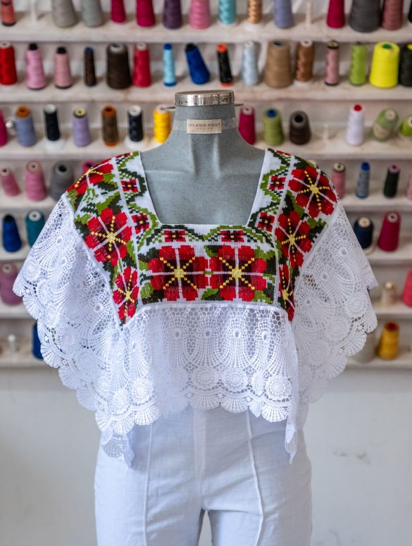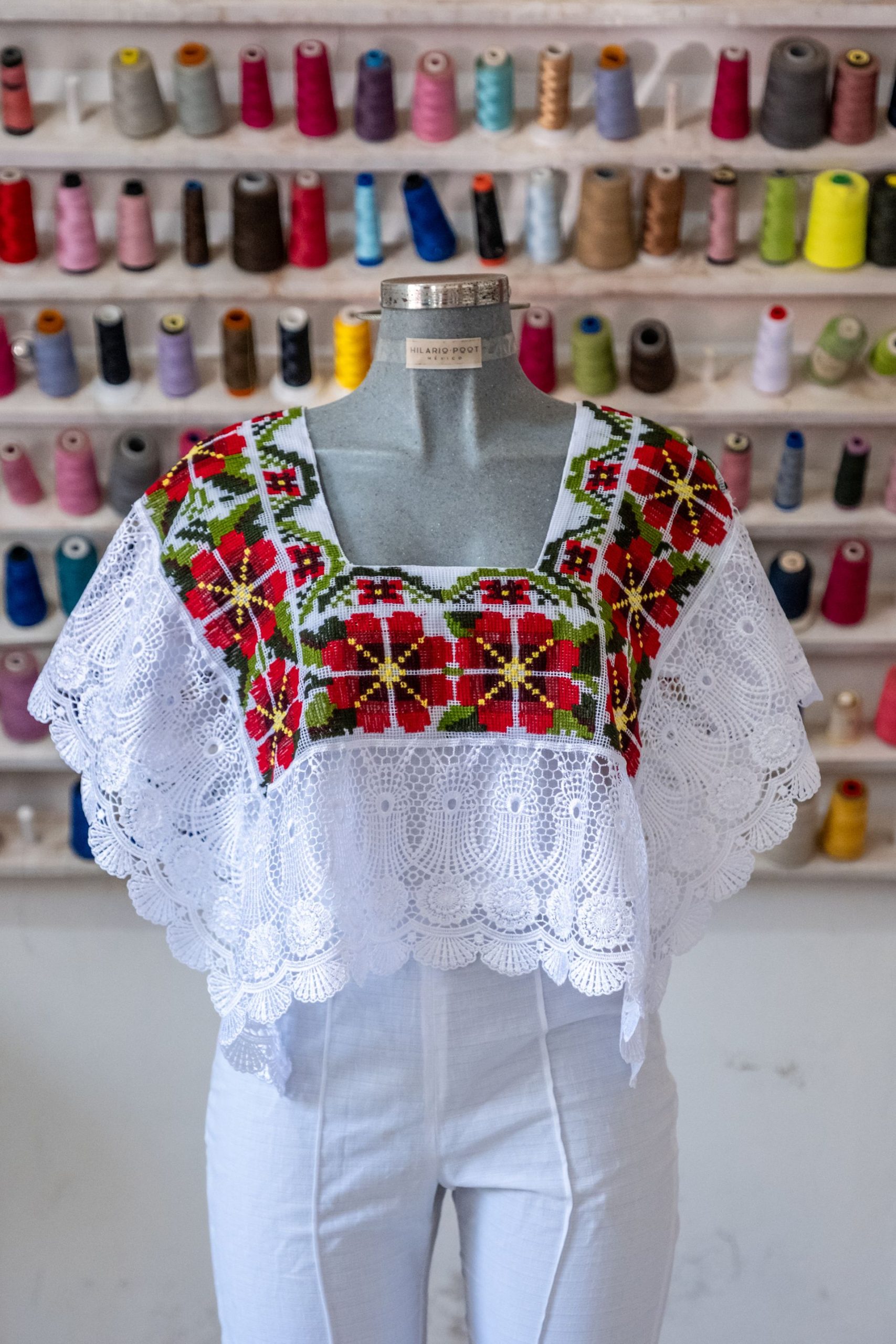 Elegancia con raíz mexicana. Blusa Flores Noche Buena, bordada a mano en punto de cruz fino. Ideal para quienes buscan estilo auténtico, calidad artesanal y un toque festivo en cada detalle.