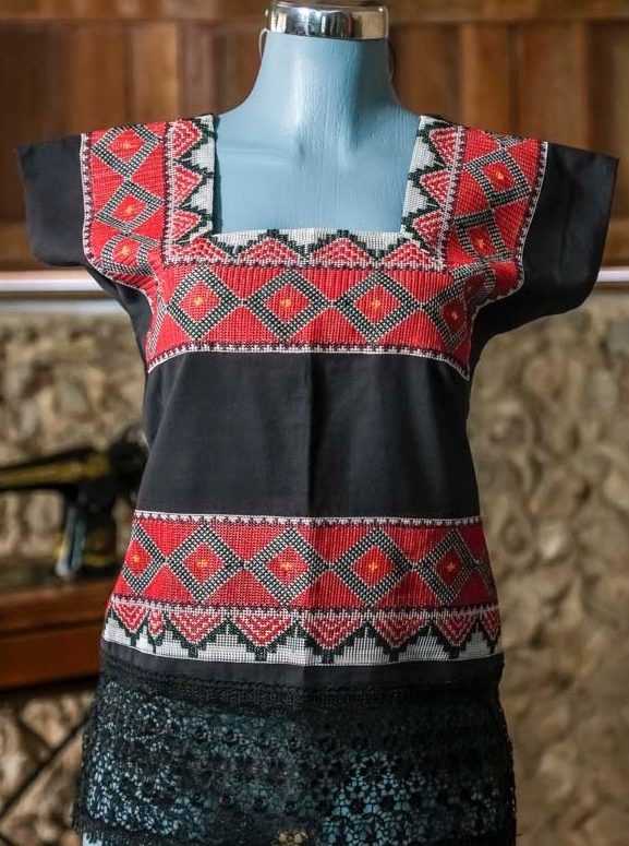 Blusa negra con rombos: bordado artesanal en punto de cruz fino sobre lino y canevá, con estambre que realzan su diseño. Una prenda con estilo e identidad.