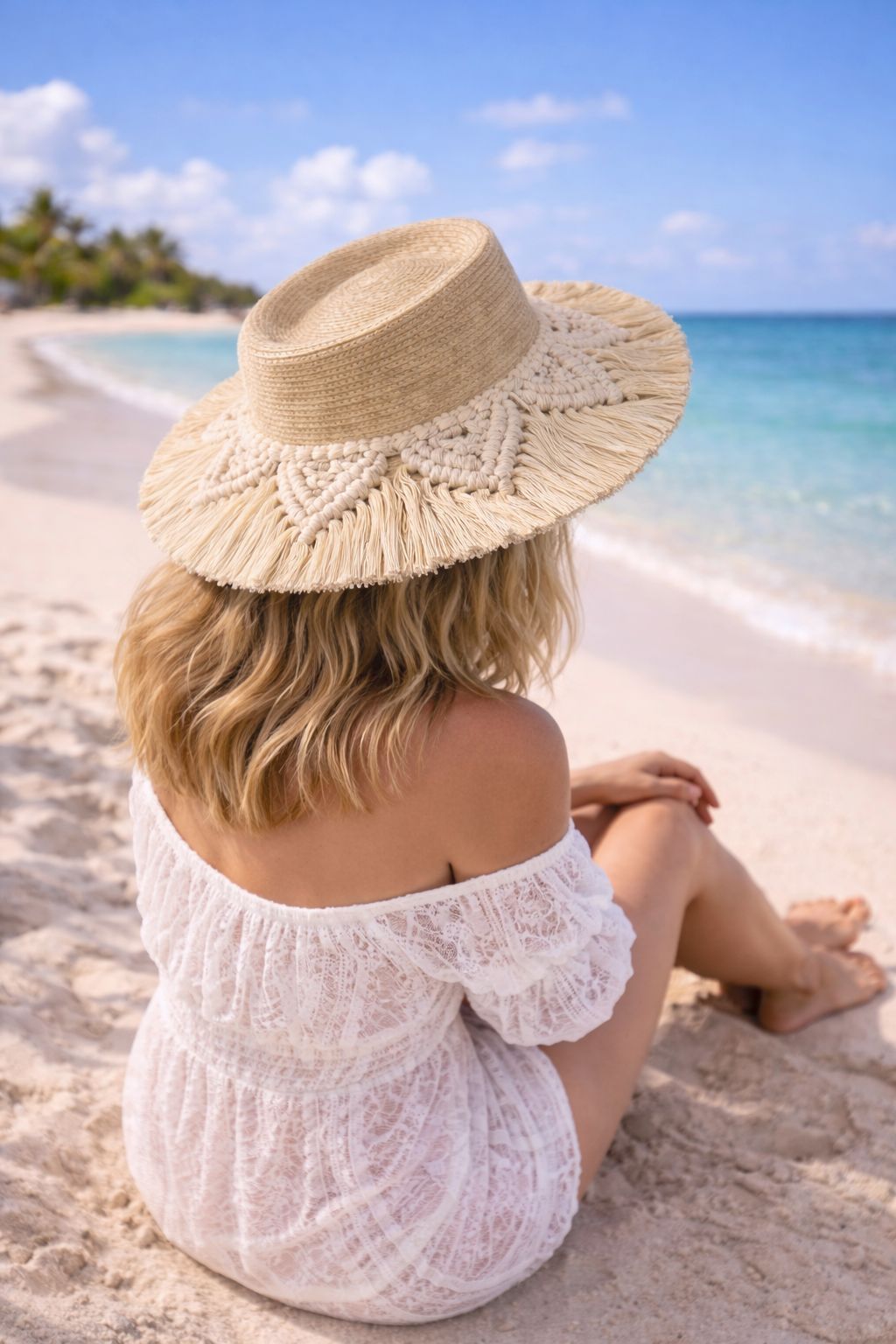SOMBRERO DE PALMA DECORADO EN MACRAME-HECHO EN QUINTANA ROO