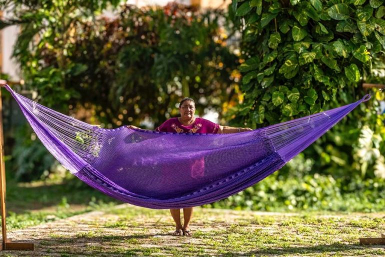 Hamaca púrpura urdida a mano con hilo de seda marca elefante, tiempo de elaboración 1 mes