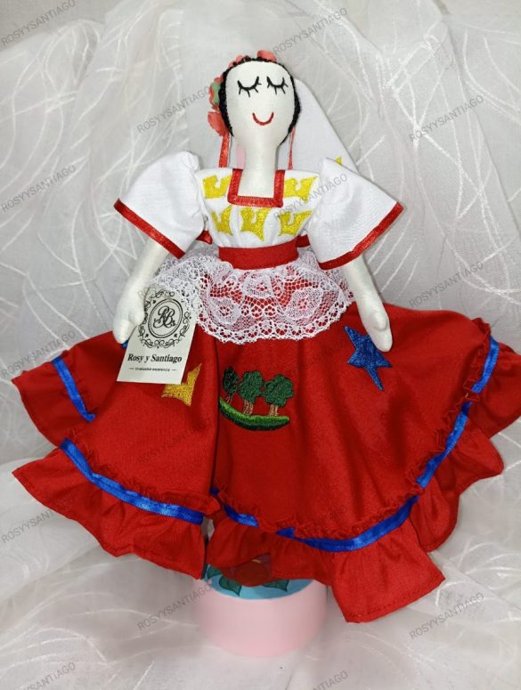 Muñeca artesanal con vestimenta tradicional representativa de Quintana Roo. Elaborada con algodón, liston y encaje ingles.