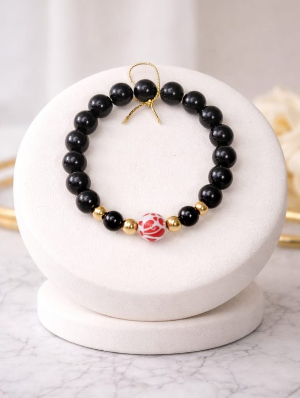 Pulsera artesanal con sello de autenticidad de Quintana Roo y distintivo Hecho en México, elaborada a mano con una perla de Talavera en tonos rojo y blanco, cristales negros de brillo profundo y cuentas de acero dorado. Su diseño elástico de 16 cm ofrece comodidad y elegancia en cada uso. Una pieza única que armoniza tradición mexicana y estilo contemporáneo, perfecta para elevar cualquier atuendo con un toque de distinción.