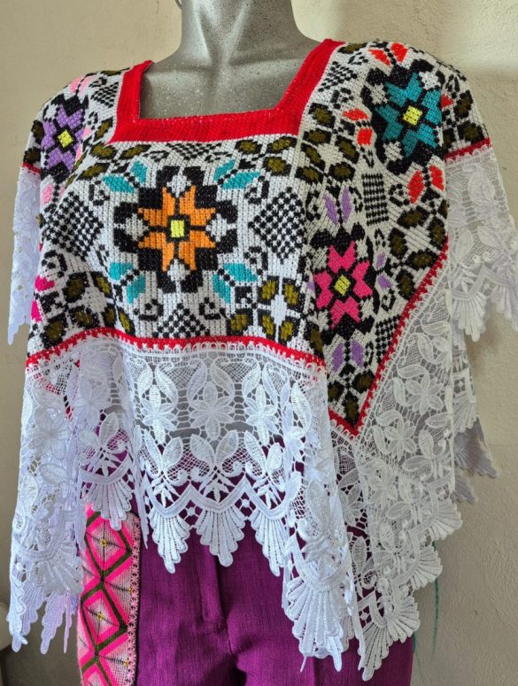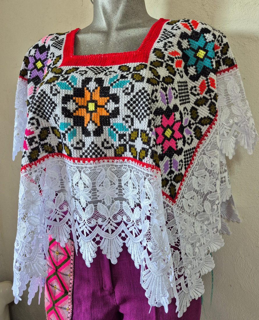 Adornada con encaje guipur de color blanco.