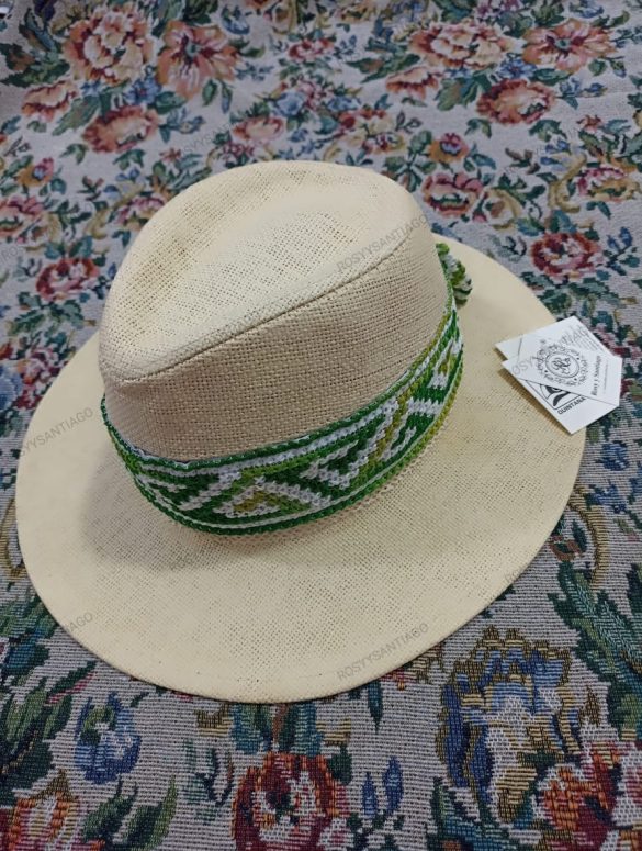 Bello sombrero para dama, con toquilla bordada a mano, con bordado iconográfico en color verde jaspeado y detalle de lazo del mismo bordado.