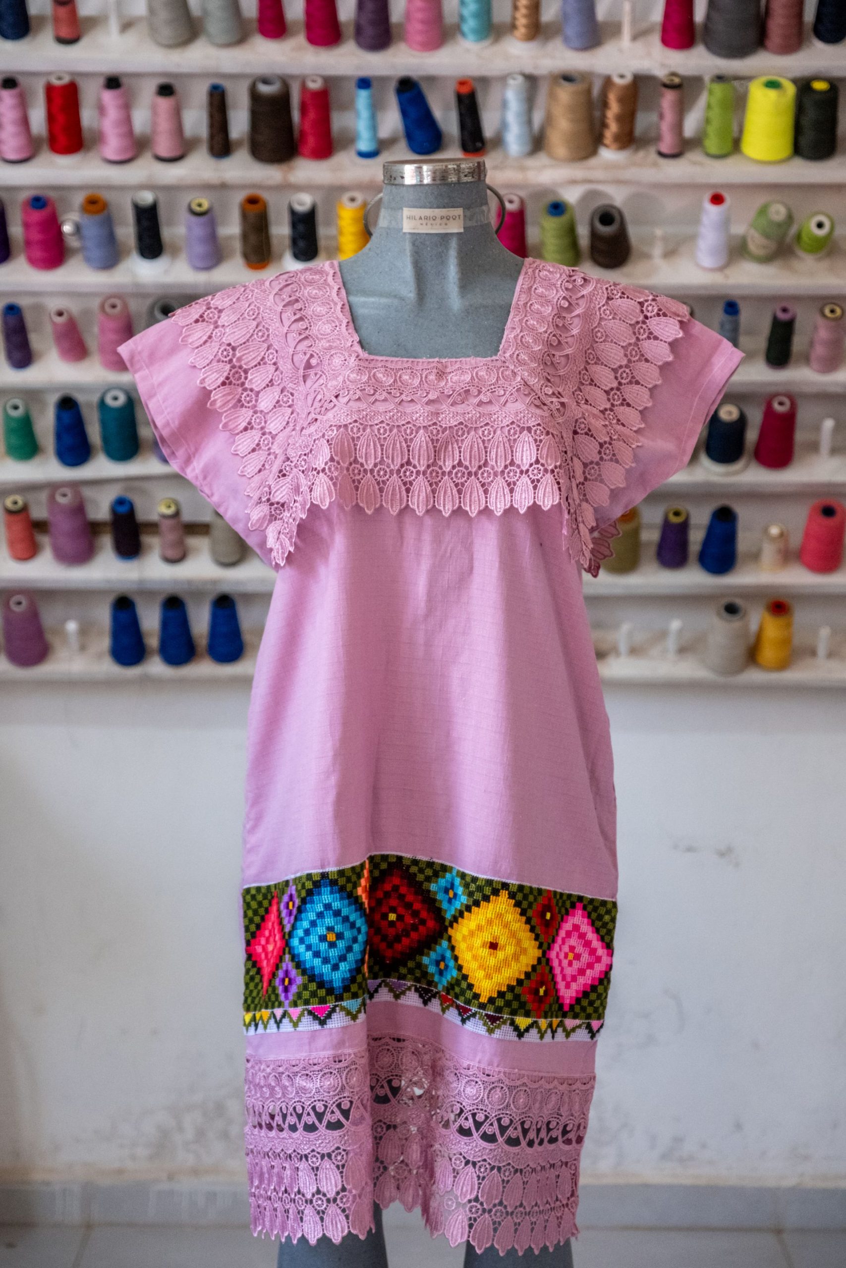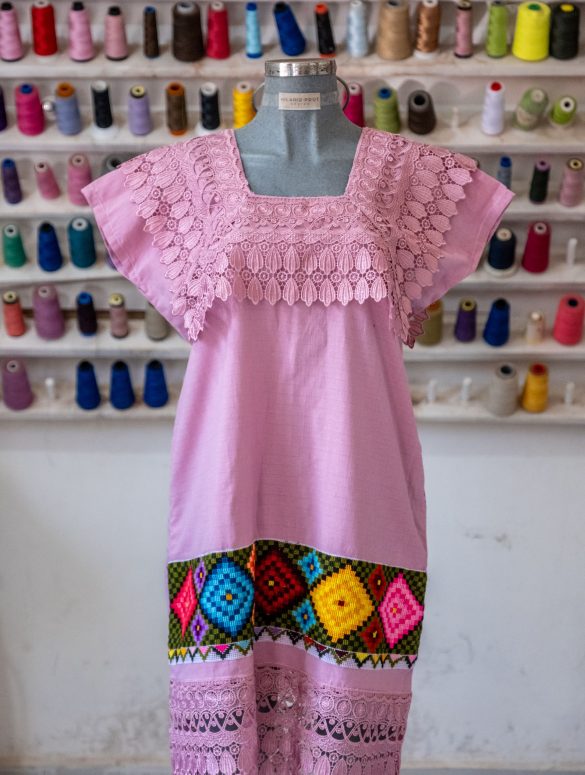 Vestido artesanal con diseño de rombos, bordado en punto de cruz sobre tela de lino. Incluye detalles en encaje y caneva. Confección tradicional que garantiza autenticidad, frescura y calidad.